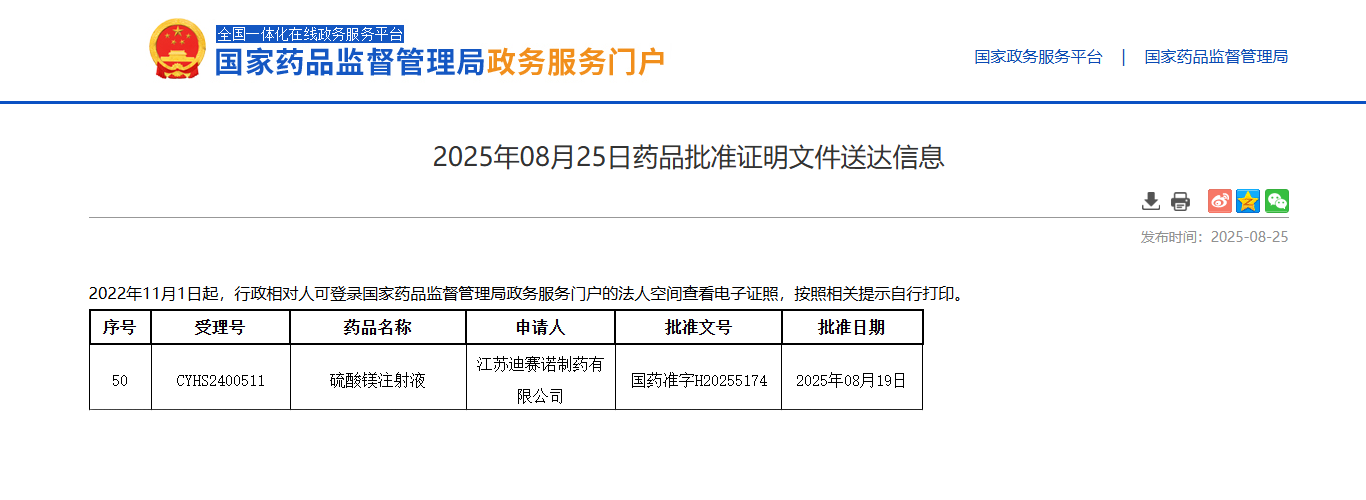 近日,万搏收到国家药品监督管理局签发的硫酸镁注射液获批信息通知,并在国家药品监督管理局政务服务门户平台公示。